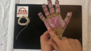 Attach the tubes to the cardboard along each finger, thumb, and the metacarpals using tape. Be sure to leave the bended joints “open”. Attach a piece of string to the top of each finger and thread it down through the corresponding phalanges and metacarpals and down past the wrists. Leave about 2 inches of twine to hang past the cardboard.